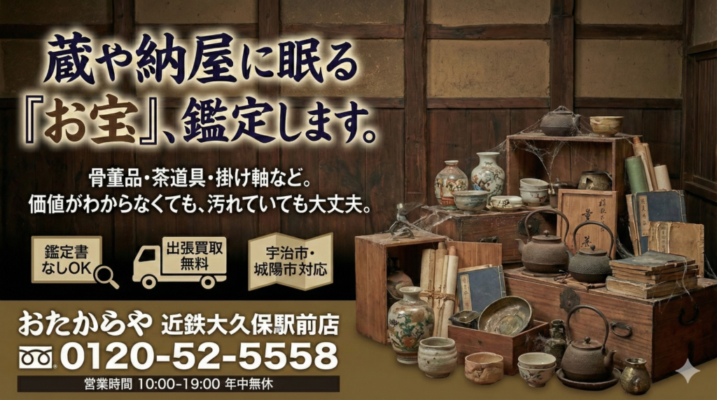 【宇治市・城陽市】蔵や納屋の片付け、捨てる前にご連絡ください!茶道具・骨董品の出張買取|おたからや近鉄大久保駅前店